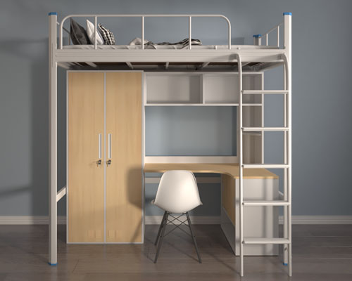 上圖三中的雙層鐵床圖片,與上邊兩種都是相同的,只不過它的下鋪的家具都有所變化,從雙開門的柜子,到上下開門的柜子,不僅可以放衣物,還可以放鞋子,還可以在這里坐坐,看看書,聊聊天,在我們工作之外的時間里,還可以有著自己的休閑時光。