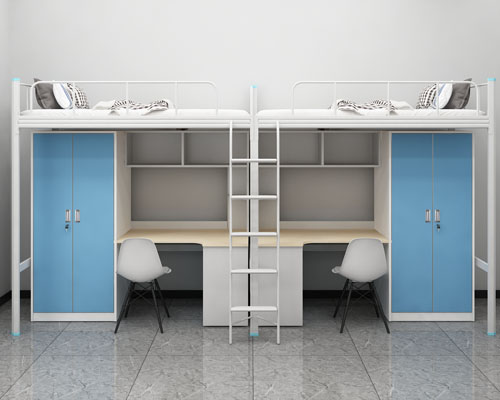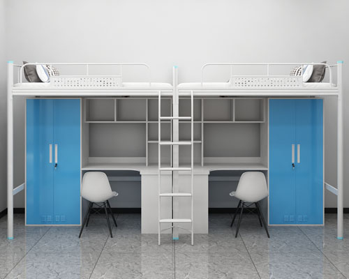 4、下圖中的學生雙層鐵床,雖然,是一個連體的,但它的下鋪里的桌子柜子都可以選款,有的可以用木制的,還有的用鐵制的,主要看自己喜歡哪一種,就選哪一種!它的價格一般是300多一張,具體還得找廠家實際報價!