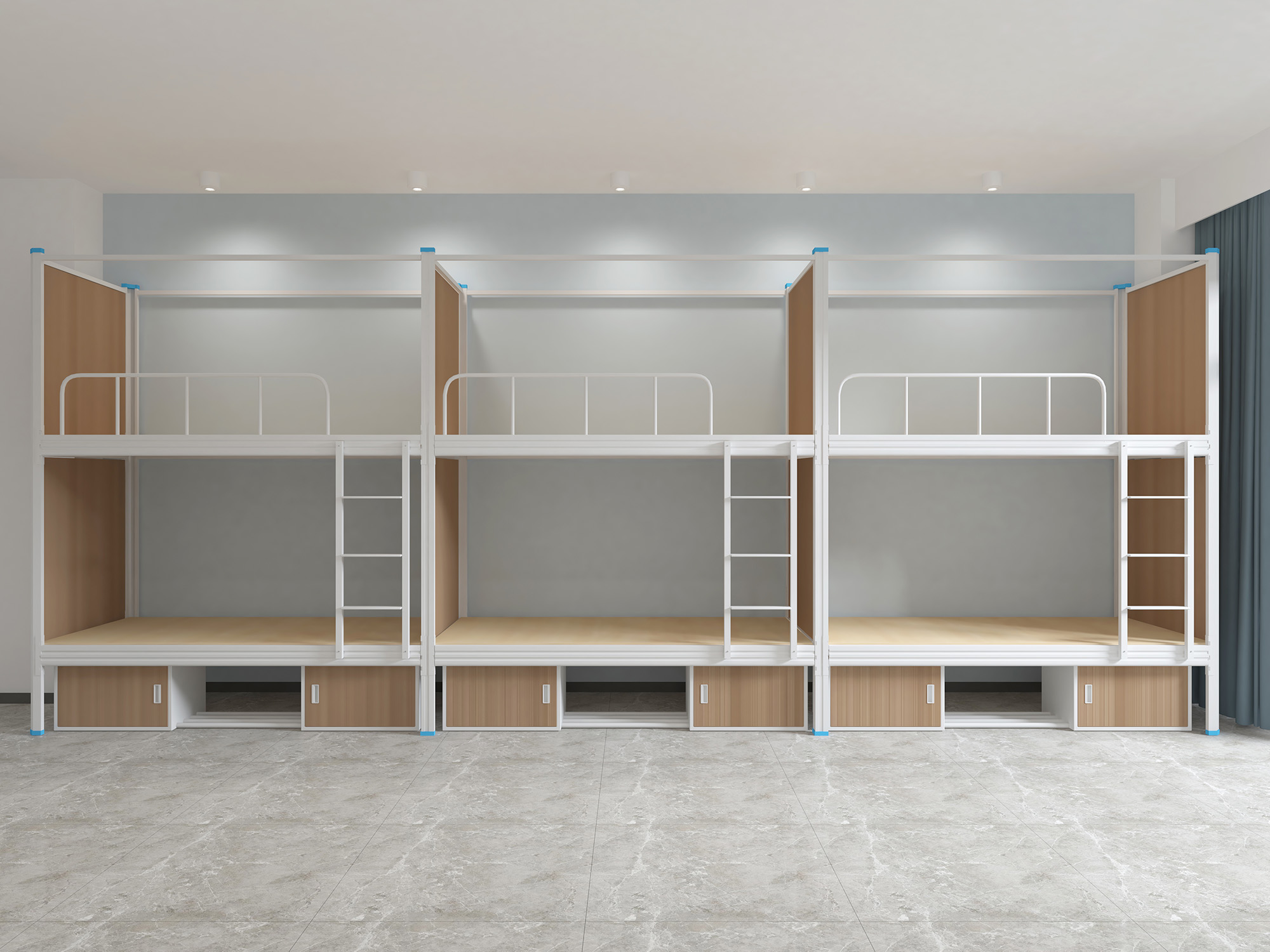 1.8、床支撐:采用尺寸為 20*30*0.9mm 優質方管制作,掛在長橫梁里面,床板壓住后無法取出來,避免取出當做暴力工具。